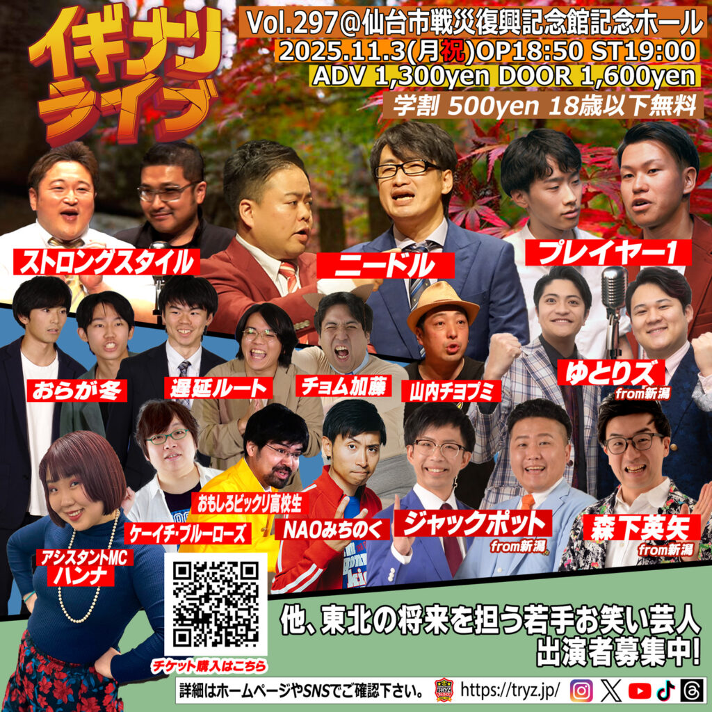 仙台のお笑いプロダクション、仙台ティーライズ所属芸人をはじめとする東北を中心に活動するお笑い芸人達がネタの面白さでランキングを競い合うライブです。オーディションコーナー「初チャレ」「サポート芸人1分勝負」もあり、挑戦者も受付中!まだ出演したこと無い方出演者募集中!