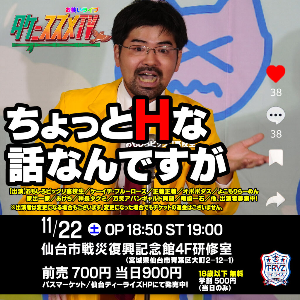 仙台のお笑いプロダクション、仙台ティーライズ所属芸人をはじめとする東北を中心に活動するお笑い芸人達がネタの面白さでランキングを競い合うライブです。オーディションコーナー「初チャレ」「サポート芸人1分勝負」もあり、挑戦者も受付中!まだ出演したこと無い方出演者募集中!